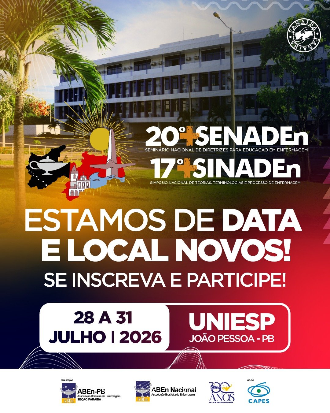 É com elevada honra que damos as boas-vindas aos participantes do 20º SENADEn e do 17º SINADEn, que se realizarão entre os dias 28 e 31 de julho de 2026, no Centro Universitário – UNIESP em João Pessoa (PB). Este encontro, de caráter nacional e estratégico, reafirma o compromisso da enfermagem brasileira com a excelência na formação, na prática e na inovação, tendo como norte o tema central: “Formação, Prática e Inovação em Enfermagem para o Cuidado Seguro, Sustentável e Transformador”. Trata-se de um espaço privilegiado de diálogo, reflexão e construção coletiva, que fortalece a identidade da profissão e contribui para o avanço das políticas educacionais e assistenciais em saúde e em enfermagem.
